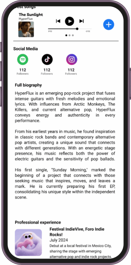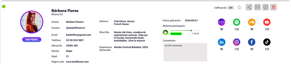 - Mensajería directa para coordinar audiciones o presentaciones.