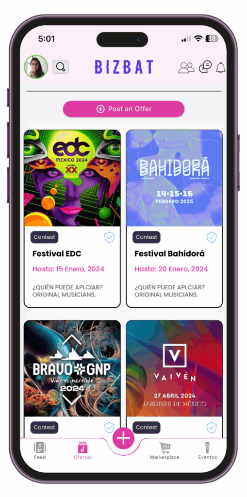 Cualquier persona u organización relacionada con la música: disqueras, escuelas, festivales, bares, empresas, marcas, organizadores de fiestas, fans, etc. BizBat está diseñado para conectar a todos.